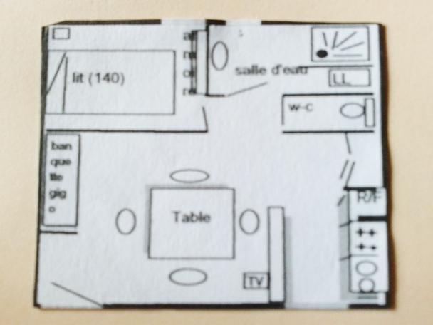 une pièce principale avec un coin salon ( banquette gigogne) et un coin cuisine équipé d'un micro ondes, four, ...